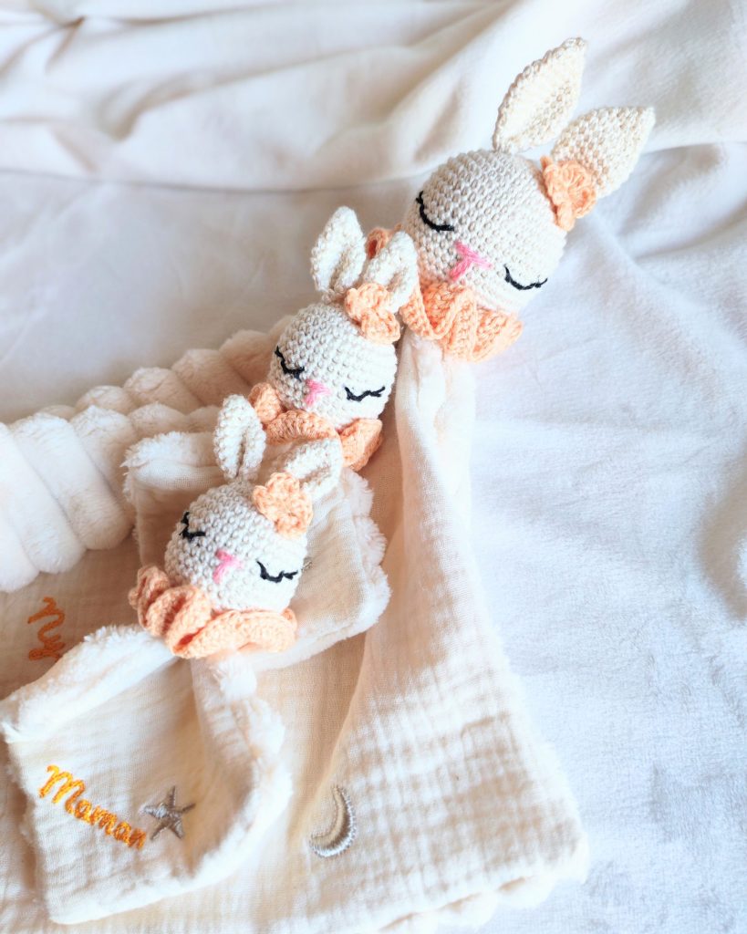 Doudous faits main pour rassurer, apaiser et câliner avec tendresse.